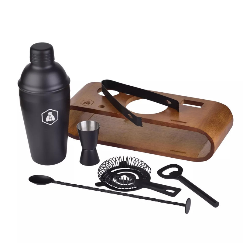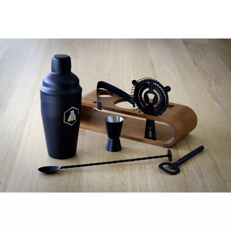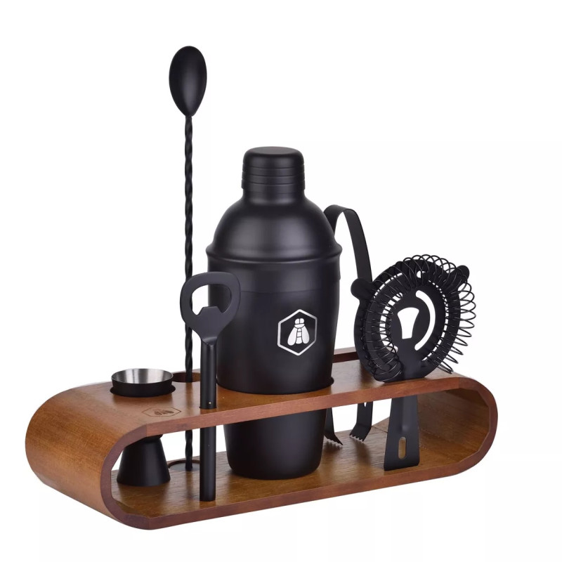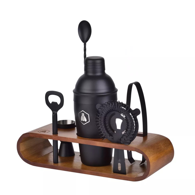 - Support en Bois Raffiné : Les accessoires sont organisés sur un support en bois au design élégant, qui ajoute une touche de sophistication à votre bar. Ce support permet de ranger les outils de manière pratique et esthétique, tout en les gardant à portée de main.