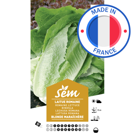 Graines Laitue Romaine Blonde Maraîchère : variété rustique à longues feuilles croquantes et tendres, idéale pour les salades estivales et les accompagnements.