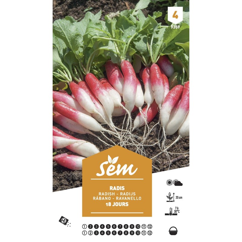 Le Radis de 18 jours porte bien son nom, offrant des récoltes ultra-rapides pour les jardiniers pressés ou débutants. Apprécié pour sa chair croquante et légèrement piquante, il est parfait en salade ou à croquer nature. Avec une hauteur de 20 cm, il pousse facilement sous soleil ou mi-ombre et tolère une large plage de températures, de 7 à 30°C, ce qui en fait un incontournable pour toutes les saisons.
