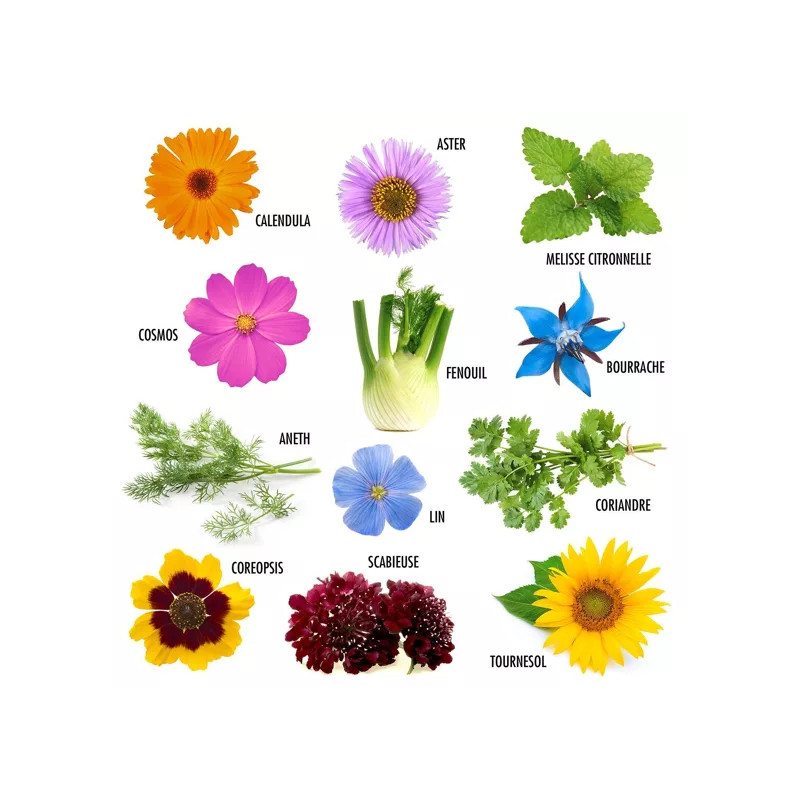 Ce coffret contient une sélection de 12 variétés de fleurs mellifères, idéales pour attirer les pollinisateurs :