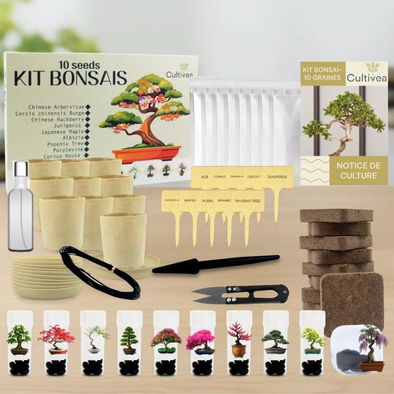 Le Kit 10 Bonsaïs à Planter de Cultivea est un coffret complet pour cultiver 10 variétés rares de bonsaïs chez vous, même sans jardin. Idéal pour débutants et passionnés, ce kit contient tout le nécessaire : graines sélectionnées, pots en feutre, outils et une notice illustrée en 5 langues. Éco-friendly, vegan et fabriqué en France, il vous invite à découvrir l’art millénaire du bonsaï en toute sérénité.