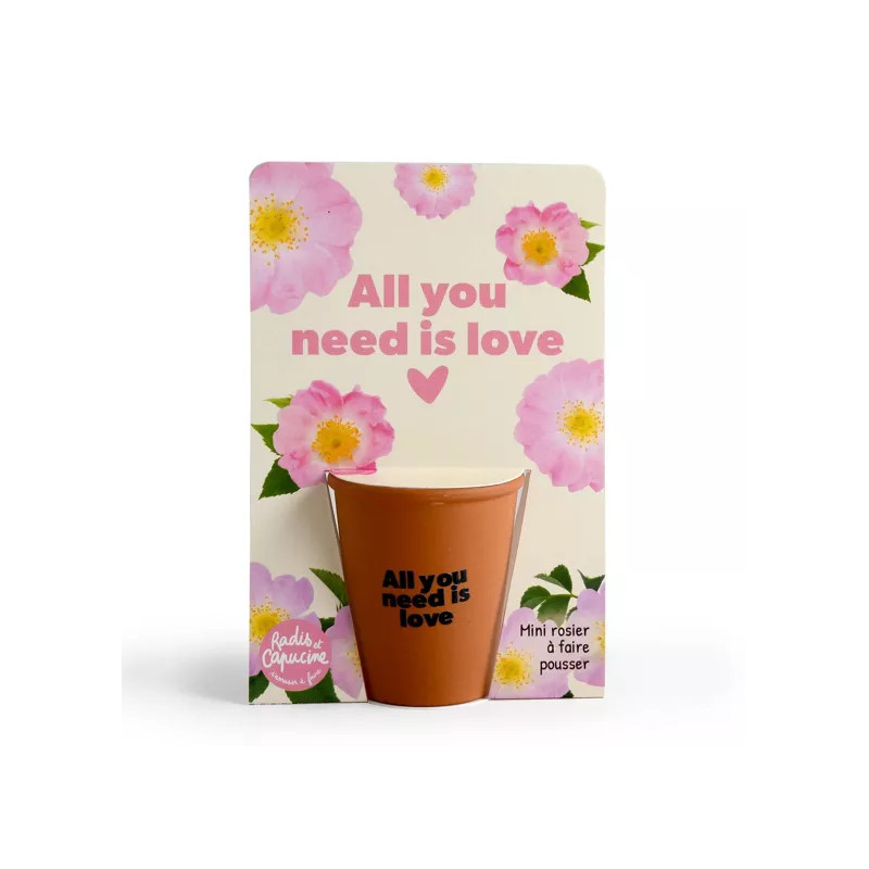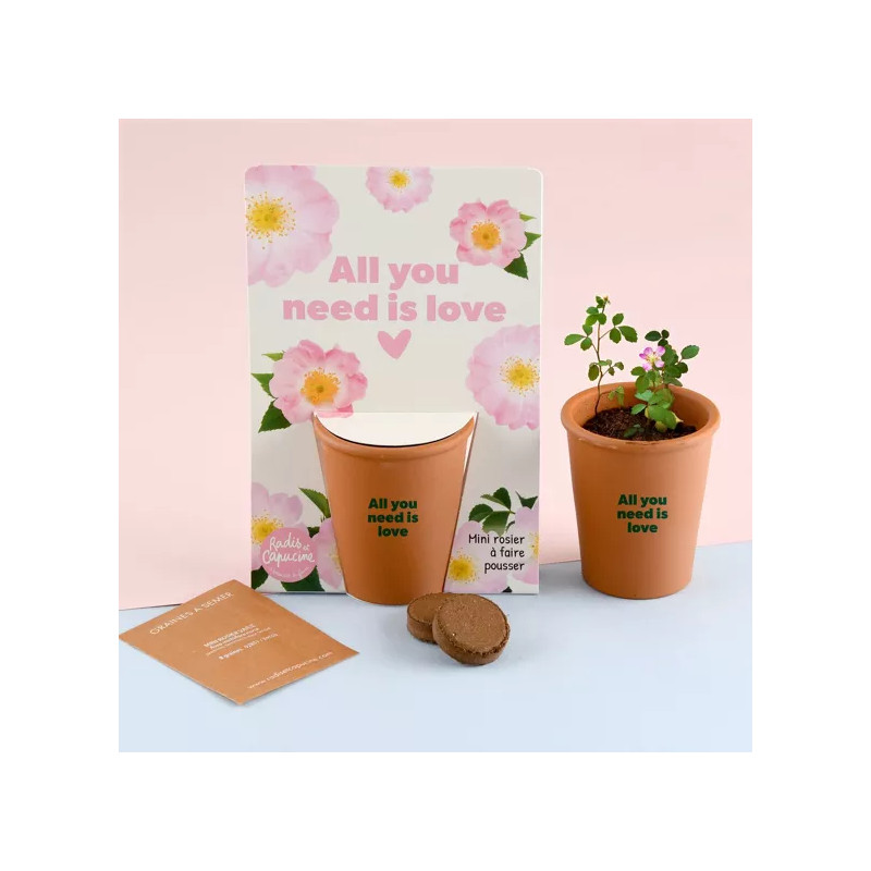 Le Kit Jardinage "All You Need Is Love" Rosier de Radis et Capucine est un cadeau romantique pour faire pousser un rosier chez soi. Ce kit contient un pot en terre cuite, un sachet de graines de rosier et 2 pastilles de coco à réhydrater. Éco-friendly, zéro déchet et fabriqué en France, c’est une attention pleine de sens pour dire "je t’aime" autrement.