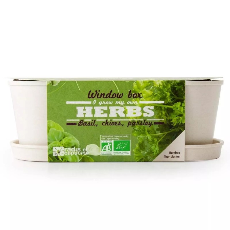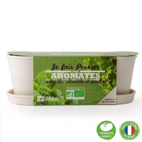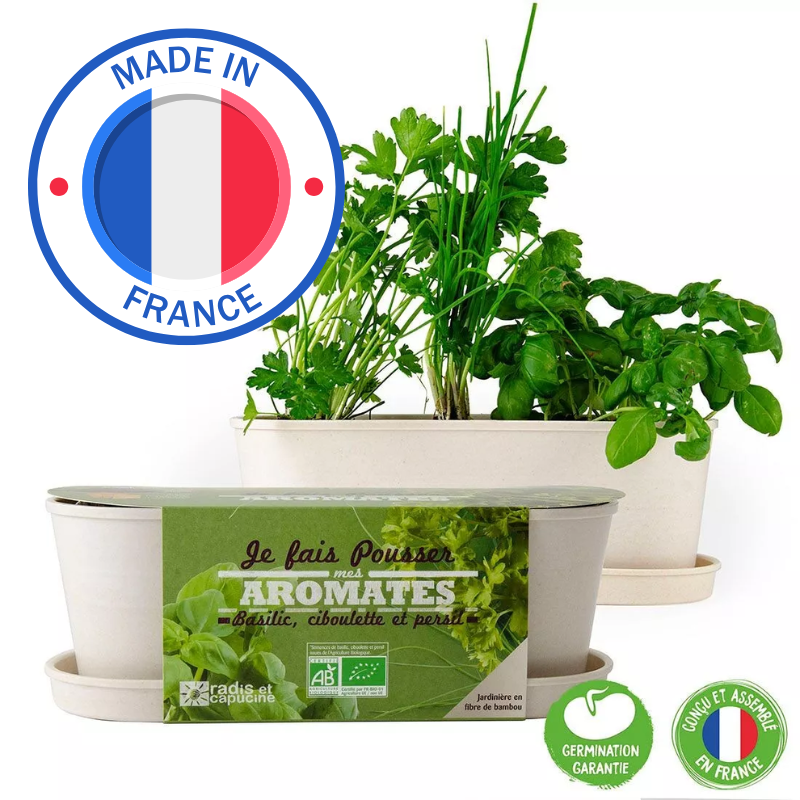 - Aromates bio inclus : graines de basilic, persil et ciboulette pour une culture saine et savoureuse.